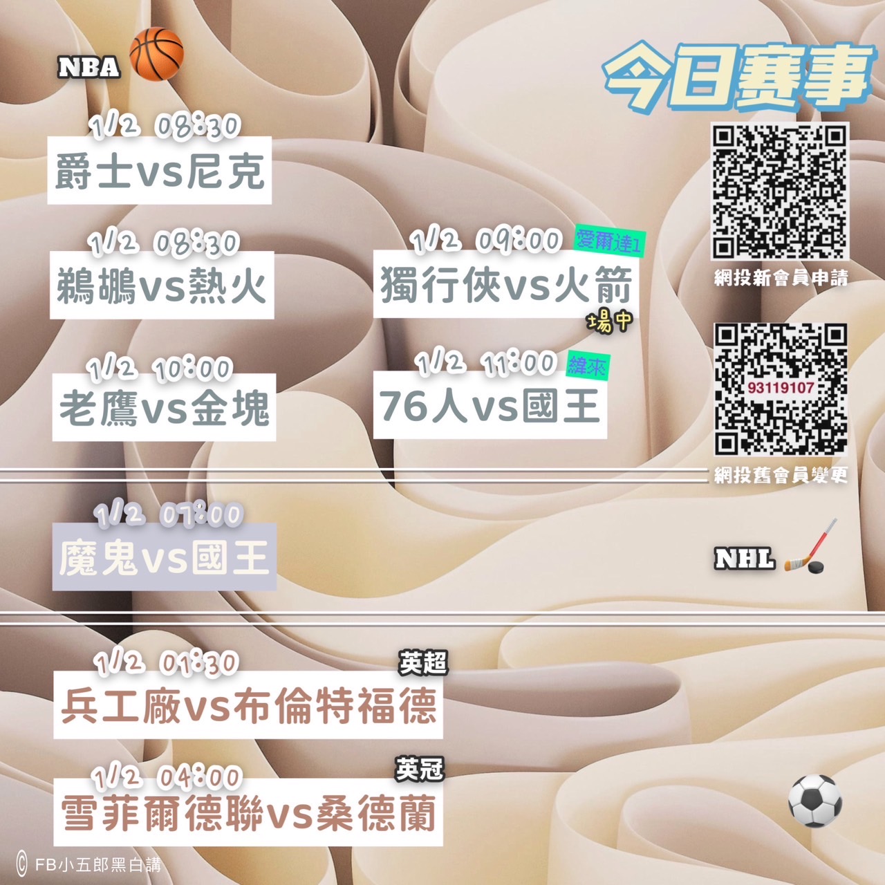 🏀NBA 1/2 08:30 鵜鶘vs熱火 🏀NBA 1/2 09:00 獨行俠vs火箭 🏀NBA 1/2 10:00 老鷹vs金塊 🏀NBA 1/2 11:00 76人vs國王 🔗FB小五郎黑白講 https://www.facebook.com/kogoro5563/
