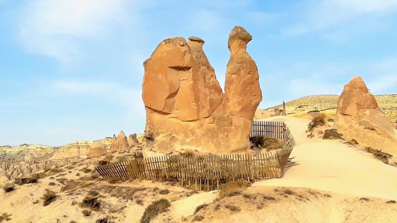 卡帕多奇亞.駱駝岩這塊岩石長得像駱駝,因此名駱駝岩Camel Rock,以前沒圍柵欄,但因為遊客時常攀爬,為了保護駱駝岩,因此才裝了柵欄