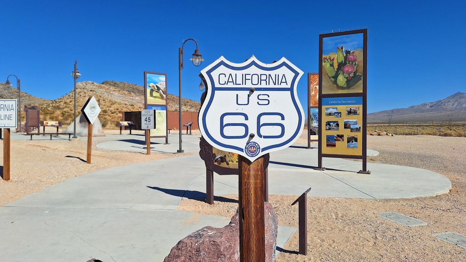 Valley Wells Rest Area - Southbound 休息站,位於美國加利福尼亞州 Nipton 附近,屬於州際公路 I-15 南向(Southbound),大約在里程標記 270 處,距離加州-內華達州界約 26 英里。 這是一個由 Caltrans 管理的公共休息區,提供廁所、飲水、寵物區和停車位,最大停留時間為 8 小時,主要服務長途駕駛者,特別是穿越 Mojave 沙漠的旅客。 該休息區以 Valley Wells 命名,源自當地歷史上的兩個水井,用於支持礦業和牧場活動。 交通方式 Valley Wells Rest Area 僅能從公路直接進出,沒有其他公共交通或替代路線,主要依賴自駕。從拉斯維加斯(Las Vegas, NV):沿 I-15 南向行駛約 40-50 分鐘(約 45-55 英里),經過 Primm(州界賭場區)後不久即可抵達。 這是從拉斯維加斯前往南加州(如洛杉磯、Barstow)最常見路線,休息區位於沙漠中段,非常方便。 從 Barstow 或洛杉磯方向:從 Barstow 沿 I-15 北向約 50-60 英里(約 45-60 分鐘),經過 Baker 小鎮後繼續北上。 從洛杉磯出發全程約 3-4 小時(約 200 多英里),途中會經過多個沙漠休息區。 基本資訊與設施 位置:I-15 南向,靠近里程標記 270(mile marker 270),距離加州-內華達州界約 26 英里西側,靠近 Nipton 小鎮(San Bernardino County)。 設施:無障礙廁所、飲用水、野餐桌區、公用電話、寵物區、食物自動販賣機。休息區乾淨、照明良好,並設有歷史資訊看板,介紹當地 Mojave 沙漠與 Valley Wells 的礦業歷史(例如 1860 年代 Clark Mountain 銅礦發現、Yates Ranch 牧場等)。 開放時間:24 小時開放(但可能因維護暫時關閉,建議使用 Caltrans QuickMap 確認最新狀態)。 停留限制:通常最多 8 小時,適合短暫休息,不適合過夜露營。 特色:周邊是廣闊的 Mojave 沙漠,環境荒涼但乾淨安全,常被稱為「穿越 Mojave 前往拉斯維加斯的必停點」,有歷史標誌牌解說當地礦業與牧場故事。 Valley Wells Rest Area - Southbound(南向谷井休息區)與著名的 66 號公路(Route 66) 在地理位置、歷史背景及交通演變上有著緊密的聯繫: 1. 地理交匯與交通門戶 雖然 Valley Wells 休息區位於現今的 15 號州際公路(I-15) 上(靠近內華達州邊界,位於 Baker 與 Primm 之間),但 15 號州際公路在南加州路段很大程度上是為了取代並現代化舊有的 66 號公路與 91 號美國國道而建的。 地理聯繫: 從 Valley Wells 南下約 50 英里即可到達 巴斯托(Barstow)。巴斯托是 66 號公路在莫哈韋沙漠(Mojave Desert)中的核心樞紐,也是 66 號公路與 91 號、466 號國道的交匯點。 沙漠補給站: 在 66 號公路的鼎盛時期,這片沙漠地帶是旅客最艱難的挑戰之一。Valley Wells 休息區繼承了早期公路旅行中「沙漠綠洲」的功能,為翻越山口或穿越荒漠的駕駛者提供必要的修整。 2. 歷史背景:從採礦到公路旅行 Valley Wells 本身擁有深厚的歷史積澱,其發展脈絡反映了 66 號公路所代表的西進運動: 早期開發: 這裡最初名為 Rosalie,在 1890 年代因克拉克山(Clark Mountain)發現銅礦而興起。當時利用「二十騾隊(20-mule teams)」運送礦石,並在此處挖掘了兩口井作為補給,「Valley Wells」之名由此而來。 轉型聯繫: 當 66 號公路在 1926 年正式開通後,帶動了整個聖貝納迪諾縣(San Bernardino County)的繁榮。隨著交通流量從舊路轉移到現代化的州際公路,Valley Wells 也從原本的採礦與畜牧中心,轉變為服務於長途旅客的現代化休息站。 3. 文化與教育意義 目前的 Valley Wells 休息區不僅是停車場,更是一個小型文化展示點: 歷史陳列: 休息區內設有關於當地歷史的資訊牌,介紹了早期的採礦、畜牧業以及此地區如何從荒蕪之地變成全美最重要的公路動脈的一部分。 旅遊體驗: 對於許多在 66 號公路「朝聖」的遊客來說,雖然他們行經的是 I-15,但 Valley Wells 是進入 66 號公路加州核心段(如 Amboy, Ludlow)前的重要停留點。休息區內的日晷與天文解說牌,也與 66 號公路那種「探索、自由、公路冒險」的精神相契合。 美國 66 號公路(US Route 66)歷史概述 US Route 66,又稱「母親之路」(Mother Road),建立於 1926 年,是美國第一條全天候高速公路,從伊利諾州芝加哥延伸至加州聖塔莫妮卡,全長約 2,448 英里。 在加州部分(約 314 英里),Route 66 從亞利桑那州界進入 Needles,沿著 Mojave 沙漠西行,經過 Essex、Amboy、Ludlow、Newberry Springs 和 Barstow,然後南下通過 Cajon Pass 進入 San Bernardino Valley,最終抵達洛杉磯和聖塔莫妮卡。 這條公路在 1930 年代 Dust Bowl 時期和二戰期間,成為中西部農民和勞工遷移至加州的關鍵路線,象徵美國西部開發和汽車文化。 Route 66 在加州的許多路段已被現代州際公路取代: 從 Needles 到 Barstow:主要沿 I-40。 從 Barstow 南至 San Bernardino:部分沿 I-15,特別是通過 Cajon Pass,這裡曾是 Route 66、US 91 和 US 395 的共同路線。 Route 66 於 1985 年正式除役,但許多遺跡(如 Amboy 的 Roys Motel、Cucamonga Service Station 和 Aztec Hotel)仍吸引遊客。 Valley Wells休息區的日晷與北極星教育展示牌。 這個特殊的日晷裝置不僅僅是為了報時,它更像是一個教育性的天文導覽儀,旨在向旅客介紹莫哈韋沙漠清澈星空下的導航技巧。 北極星尋星儀的運作原理 這個裝置的設計核心是引導遊客透過簡單的幾何對齊來定位北極星(Polaris): 裝置構造: 它通常包含一組固定角度的指向標記或帶有孔洞的取景器。 對齊功能: 遊客站立在指定的標記位置,透過裝置上的觀察孔或沿著特定的金屬桿向上望去,其傾斜角度正好對應當地的地理緯度(約北緯 35.5 度)。 尋星教育: 裝置旁的說明牌會解釋如何利用「大熊座