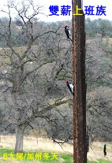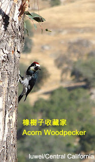 | 加州絶非賞鳥人的首選,除了几個水鳥保護區之外, 這種英文名為Acorn Woodpecker(橡子啄木鳥)是這裏的留鳥Nr.1。一年不論哪個季節都看得到它們的身影,也聽得到它們的聲音。這鳥既有美國人的工作狂,成天敲敲打打,没看它們停過,也有中國人的節儉美德,春夏秋冬地東搬西藏,我看方圓數里內能開的戶頭都開了,能存的地方都存了。法國Caisse d’Epargne 銀行和美國Wells Fargo都用松鼠作為商標,當初設計人顯然没看過橡子啄木。要是看過,他們會同意我的想法,就是Acorn Woodpecker可要比松鼠還強多了,更適合當作金融机構的代表。別的不說,就憑能飛的本事,橡子啄木採集的範圍就大多了,而且它們也不怕半路被土狼或老鷹追殺。 啄木鳥啄木不一定都為了找蟲吃! 這種橡子啄木到處啄洞,就只是為了藏它到處蒐集來的橡樹子。可是在枯樹幹上打洞就算了,它們也會在屋簷、層板等地方打洞,如果完全不管,這些傢伙可以在一季裏把屋子的牆都給打滿了洞! 再碰上冬雨淋,夏風吹的,嘿嘿! 勤奮又節儉的橡子啄木可以在几年裏把一棟房子給啄垮! 二哥的小農還有另兩種常見的啄木,其一是冬天鬧的最兇的紅胸吸汁啄木(Sap Sucker),一頭紅髮, 用害鳥、益鳥,害蟲、益蟲來區分物種是咱們小時候的自然教學,從現代多元物種生物學的角度看,這樣子的分法有受限於一時、一地的主觀觀察,往往受不了更長遠, 話是這麼說,人嘛! 不都護著人的利益,難道都要像傳教士那樣護神嗎? 呵呵!所以我還是偏愛另一種專吃蟲,不會亂打洞,也不會大聲喧嘩的啄木 – Nuttall’s Woodpecker。 |
