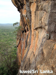 先講一定碰得到,也是最好認的斯里蘭卡彌猴(Toque Macaque)。這種猴兒外表和台灣彌猴很像,都是淺土色的皮毛,紅臉、黑耳,龐克頭,短尾巴,只是個子比台灣彌猴又小,又瘦。國家窮還是富,不用看股市,看猴子就知道啦! 可也別看這些傢伙個子瘦小,兇悍勁兒一點不輸風景區的鏢客,特別在掛上UNESCO(世界遺產 ?)的名勝區,像丹布拉千佛洞(英文名字是Dambulla Cave Temples)、波羅納魯瓦王城(Polonnaruwa Royal city)和獅子岩王城(Sigyria)等地,都一定碰得到他們。我在斯國佛寺門前就看到几回這些猴鏢客公然行搶,把香客要供佛的荷花給搶了,就大落落地當眾坐下來撥著吃! 若是搶不到,還會Macaque ! 馬喀可!的罵人 ! 記得了吧 ! Macaque ! Toque Macaque !相認的時候可不能因為他們跟咱們一見如故,咱們就靈長不分!