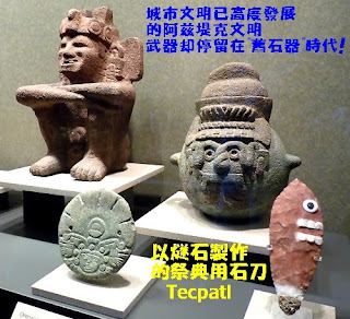 或是後古典時期的阿茲堤克人,在城市規劃、廟堂建築、天文曆法和藝術創造都是那麼豐富而精緻;但是他們最硬,最利的切割工具竟然就只是火山熔岩冷迅速卻形成的黑曜石! 阿茲堤克人硬還是用黑曜石做的石刀(納華特語稱作 macuahuitl)和獸皮鳥羽做的盾牌去對抗那批穿著鐵甲,揮舞鋼刀,發射火銃的西班牙遠征土匪 -Conquistadores!