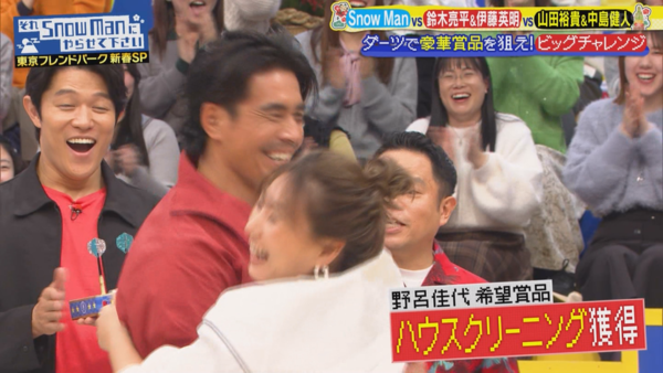 結果奇蹟來了,野呂佳代射中了伊藤桑想要的小型運動攝影機,伊藤桑就急著下一個上場,說目標是最大獎的車,或野呂想要的居家清潔服務,結果還真的射中後者,讓全場為之沸騰,野呂也開心地衝過去跟他來個大大的擁抱。 ![]()