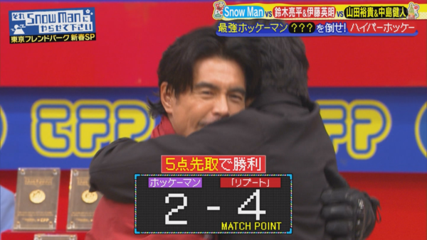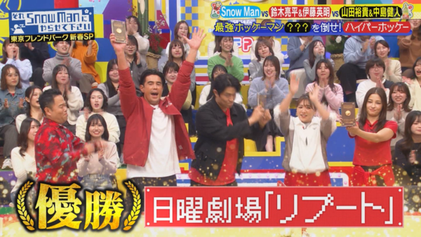 是說也不知為何,只有《重啟》隊有中途換選手,把黑木梅莎換成伊藤桑。他跟鈴木亮平並排一站,旁邊就直呼迫力驚人,他們也真的打得很好,有一種把蒙面人玩弄於鼓掌的感覺,因此最後只讓蒙面人拿到兩分就獲勝了(五分得勝)。其他兩隊都被拿到四分,而且雪人隊最後還輸了,才會讓《重啟》隊奪冠。