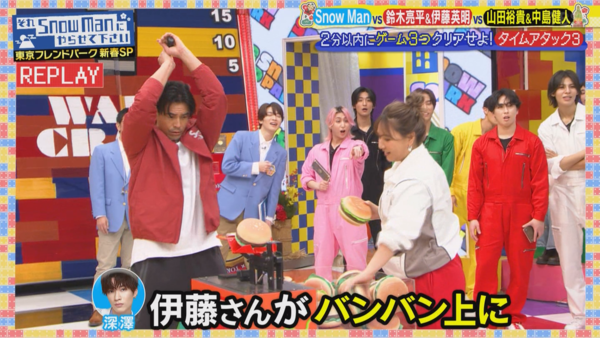 12.在二分鐘內過關三個遊戲的環節,伊藤桑先是負責拿球給野呂佳代丟,看起來完全是認真盡責的乖寶寶;接著要拿槌子把漢堡打到三個不同的容器裡。他是所有挑戰打漢堡的人中,最快達標的,而且真的是一個漢堡一個容器,沒有二個漢堡打到同一個容器過(包括示範的深澤都有),真的很厲害,伊藤桑玩這類遊戲意外地上手呢。