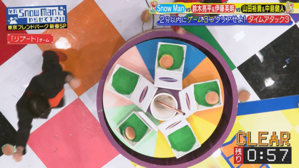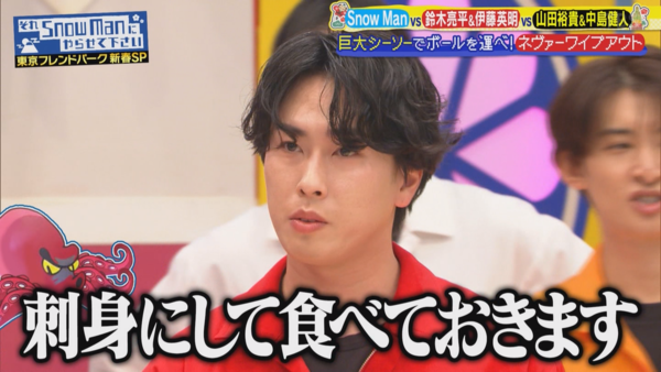 果然,鈴木伸之雖然沒有跳得很好,但好歹有分數,於是自此鈴木亮平的稱呼就變成「《重啟》的人」了。 (後來鈴木亮平好不容易在遊戲裡贏過鈴木伸之,拿回「鈴木」這個姓,卻又因為鈴木伸之不甘心,在下一個環節主動提議拿「鈴木」作賭注,讓他頓時慌了,抗議說「為什麼會變成要讓人失去名字的機制?!」) 6. 在翹翹板運球環節,因應新春SP,多了兩隻不時伸出來阻撓的章魚腳,把大家的球無情地踢掉,結果三隊全軍覆沒,沒人拿到金牌。