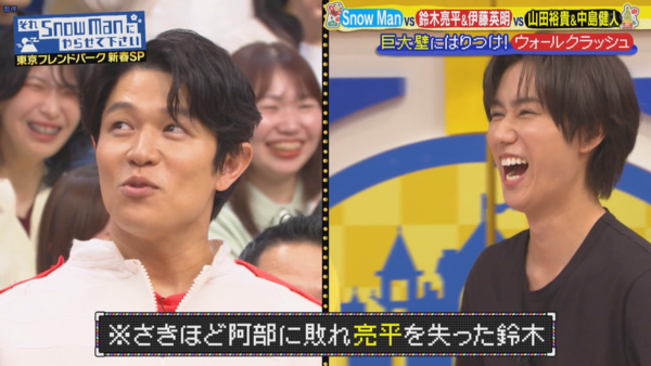 4. 在蜘蛛人跳高環節,因為雪人團的阿部亮平跟鈴木亮平名字一樣,說一說就忽然決定拿雙方的名字來當賭注,要輸的人不能再自稱「亮平」,結果先上場的阿部一下子就跳到「過關」區,讓鈴木當場傻眼,一直問怎麼做才能跳到那裡去。