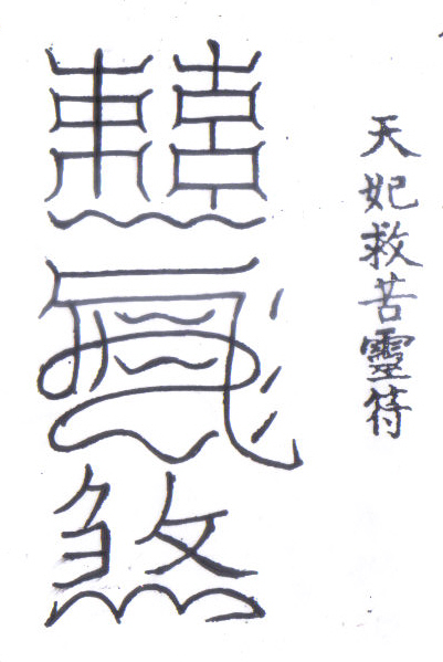 右天妃靈符,如有急告焚香,念前咒七遍,書此符,用井花水磨乳香調服,自然安好,無不應驗。