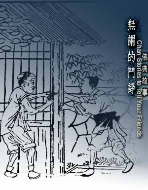 從前有一座山,山中有一間客棧。一天傍晚,遠方來了一位甲客官,打算在客棧借住一宿,主人告訴他:「所有的房間都已滿,只剩一間房間,但這間經常鬧鬼。」 一整夜,甲客官都在等待鬼的出現。就在乙客官正要開門進房休息時,甲心裡想:鬼來了!乙心裡也想:鬼在裏面! 於是,乙客官拼命地推門,想一探究竟,甲客官害怕死命地抵住門……最後,乙客官破門而入,甲客官便猛力地打乙客官,而乙客官也極力地反擊。彼此糾纏扭打成一團。 直到天亮,兩人相視,才知道原來是舊友,一晚上的鬥諍及傷害,都是一場誤會。 改寫自《大智度論》卷九十一