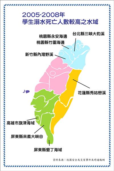 〔記者林曉雲、胡清暉/台北報導〕夏天到了,今年已有十二名學生溺水死亡、五年累計溺水死亡更高達二百七十八人,教育部昨天公布台北縣三峽大豹溪等八大死亡危險水域,呼籲學生出遊要注意安全;並將大幅改變學校的游泳課程,強調學生學會水母漂等自救能力,希望減少溺水意外。 靖娟兒童安全文教基金會執行長林月琴建議,教育部應分年齡規劃「水域課程」,並要求各級學校在暑假前通知家長,務必在暑假期間掌握學生的行蹤,並叮嚀不要前往危險水域。 教育部昨天召開「學生溺水事件原因分析暨水域安全網」記者會,公布最近五年內學生溺水死亡人數最多的危險水域:台北縣三峽大豹溪七人、桃園縣永安海邊六人、高雄市旗津海域五人,花蓮縣秀姑巒溪、屏東縣來義大峽谷、新竹縣內灣野溪、屏東縣墾丁海域及桃園縣竹圍海邊則都各有四人。 分析最近五年學生溺水死亡的原因,七成五都是學生自行結伴出遊,其次為意外落水,教育部次長吳財順表示,要提高學生自救能力,把水中自救技能的三漂(水母漂、仰漂、十字漂)列為體育課的優先實施內容,尤其是要加強學生自救能力。 雙溪國小自創防溺操 台北縣雙溪國小校長王俊杰表示,學校附近有平林溪及牡丹溪,因此師生共同研發「PUMP—蛤」陸上章魚防溺操,P(壓水—壓手、抬頭、哈口氣),U(彎曲—身體彎曲放輕鬆),M(潛浮—水中休息別驚慌),P(壓水—再哈口氣再一回)。 教育部提醒溺水危險指數有六高:國小學生占四成三五比例最高,六到七月發生率占五成二八比例最高,週六日發生占四成六五最高,下午發生占八成一比例最高,自行出遊占七成五二比例最高,溪河流及海占六成二六最高。 引用網址:http://tw.news.yahoo.com/article/url/d/a/090522/78/1jxn0.html |