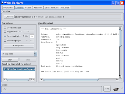 [夏肇毅知識運算網 Mark Hsia's Knowledge Computing Web]Weka Data Mining example 1- Regression with autoMpg.arff