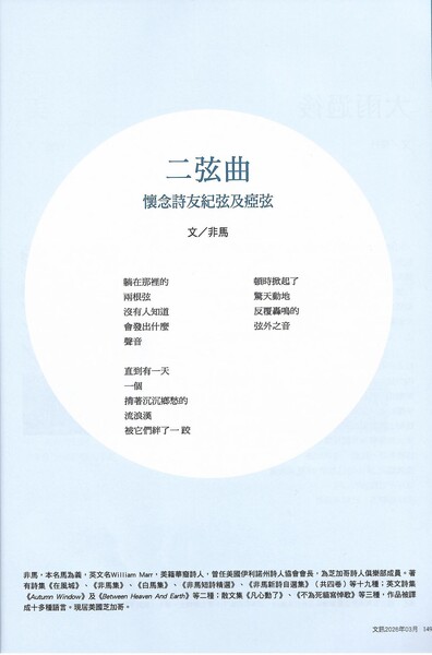 詩作〈二弦曲〉刊登於《文訊》485期,2026年3月號