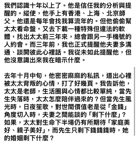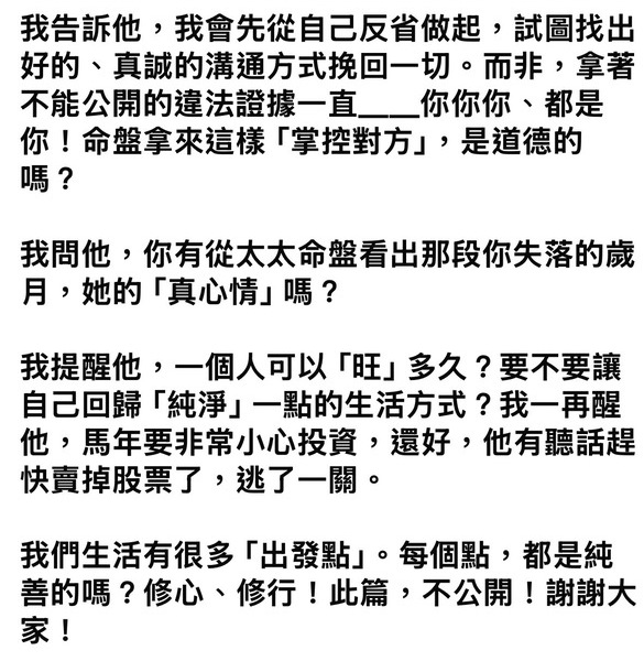 他認為自己沒有錯 背叛的是太太 所以他不願與太太深談或修復