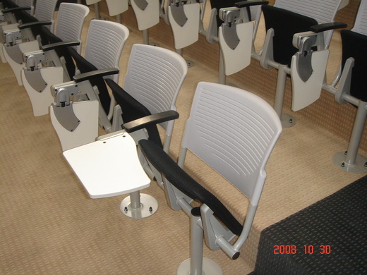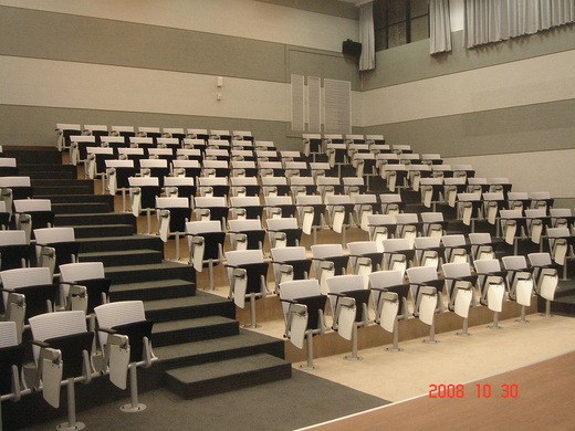 華梵工設系為創校原始5系之一,有19年歷史,圖片為2008 10 30 剛完成內部整修的142人座多媒體教室,由藝術設計學院廖院長規劃設計。系上老師的理想是希望透過設計的思維,規劃具設計感的情境教室,讓學工業設計的學生沉浸於具有質感與美感的環境中,這也是一種境教的方式。 這間教室是提供大型授課需求,並兼具專題演講的場所。椅子的座墊與桌面設計採用可以自動歸位的設計,每個座椅為獨立裝置穩定性高。 |