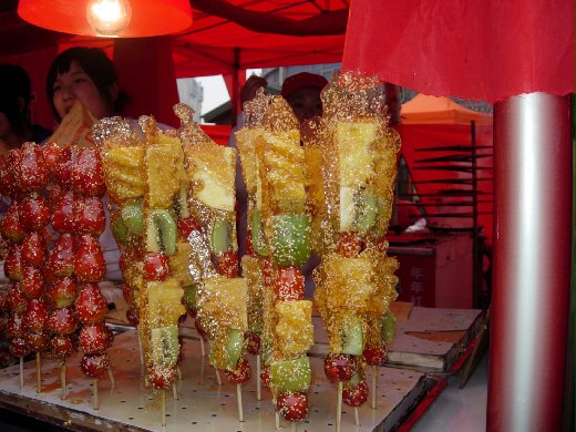 所謂的糖球即是台灣所熟知的冰糖葫蘆。這裡的女孩子喜愛糖球的程度好似男人見到美女一般,沒有不動心的。糖球的種類繁多,除了台灣常見的蕃茄及棗糖球以外,還有山楂、紅棗、山藥、黃瓜、地瓜、壽司、栗子以及各色水果糖球,幾乎把所有能吃、能串起來的食物都做成了糖球。製作過程中,油溫尚得控制在攝氏160至180度之間,做出的糖球才會香脆可口。