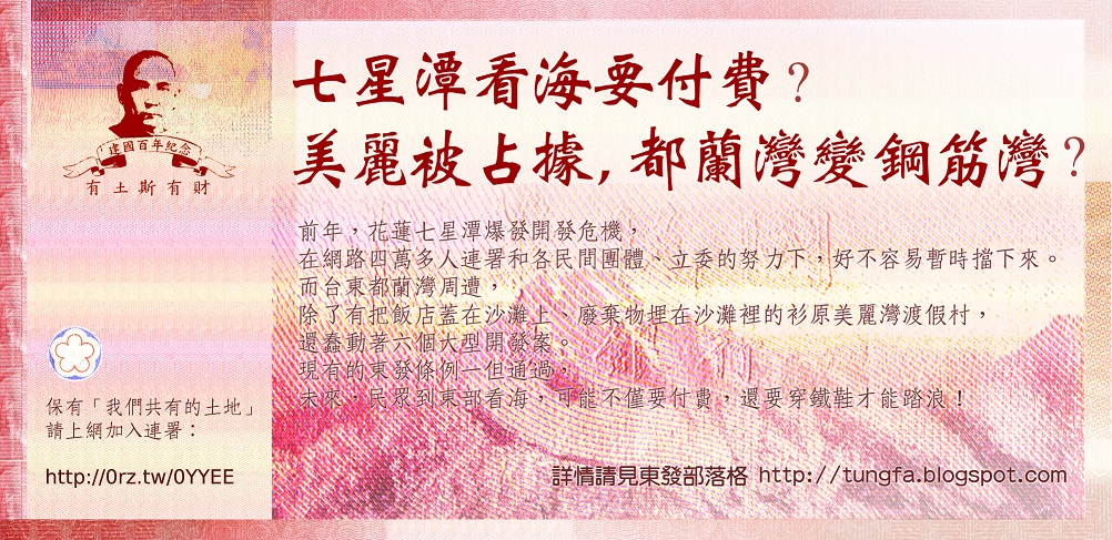 雖然東發條例開宗明義是要以「資源永續」方式促進花東的發展,但採取的做法卻是排除既定法令,將國公有土地快速釋出給財團利用,為了「財團的發展」強勢趕走世代居住、耕種的「違法」居民,罔顧人民權益及環境成本。草案7~9條土地釋出條文一但通過,財團要買賣租用國有地將更加容易,未來東部原住民的土地與文化也將同時消失,就算有錢也買不回自己的家。民間團體並非反對所有的開發,但對於東部的發展,政府理應將發展的機會和資源保留給弱勢的民眾,並且扶植能夠回饋地方居民的產業發展,怎可連居住權都從人民手上奪走,只為了集中大量資源給本來就有能力開發的財團?