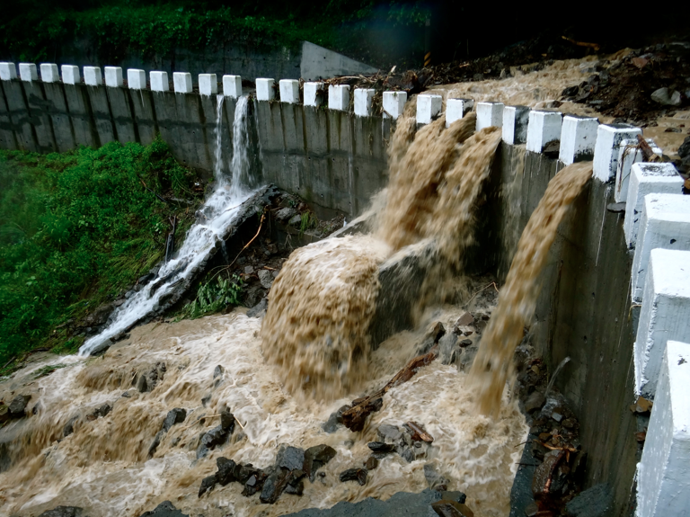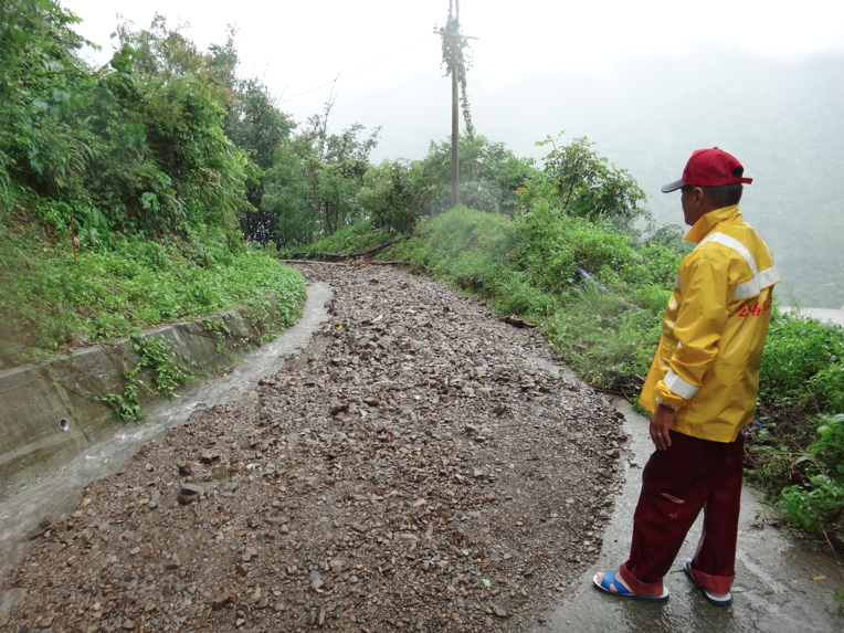 賴文德指出,這次雨不像八八風災一樣,一次下很大,「但因為慢慢下,雨又不知道要下到什麼時候,加上沒有疏濬、泥沙堆著,說不定會有危險」,因此率先把位置坐落比較危險的第一鄰,撤離到興中國小旁邊的緊急避難中心。豈料昨天白天,又發生居民發現土石流從山上沖了下來,「很大,順著我們的產業道路、還有林務局做的排水溝,直接往第五鄰沖!」 賴文德帶我到土石流的發生地點,整條道路,都被碎石塊堆滿。其中一處山溝的泥流滾滾而下,沖毀路面,往下直往林務局的集排水系統貫穿。水洩不及的,就順坡傾流,雖然有水溝,但窄仄的水溝早已滿溢。