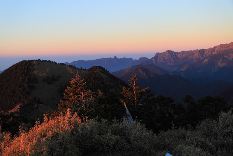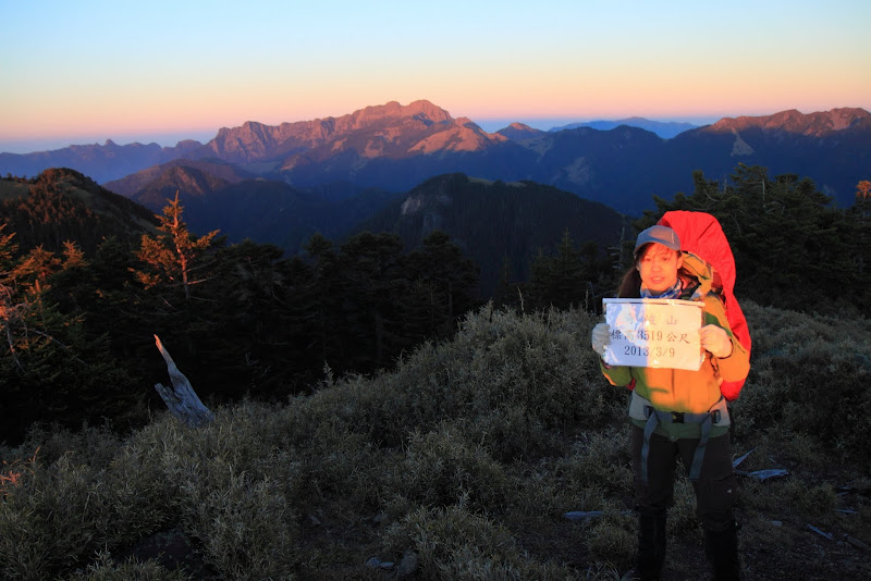 的火石山山頂,並在迎接日出雪山與晨曦山巒飽覽後回到營地收帳,再次往頭鷹山續行,