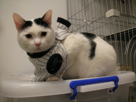 那天看夜市在賣寵物衣,因JACKAL喜歡王建民,就挑了件王建民想說給二黑過過乾癮。沒想到早上出門換好的衣服,等晚上回家就已經變成「披風」了。