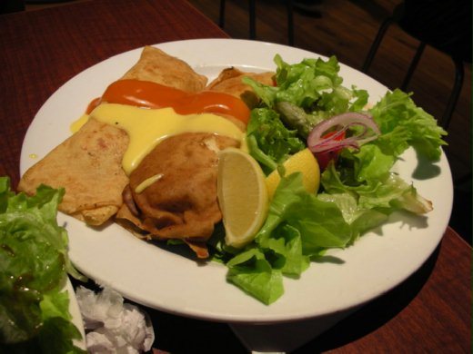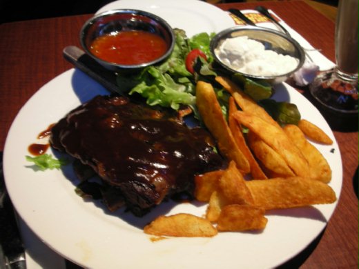 庫克船長 (Captain Cook) 是第一位登陸澳洲的英國人,他第一次登陸的地方,就是雪梨現在的 the Rocks (岩石區)。那邊有一間著名的24小時餐廳叫做 Pancake。是一間好吃到除了登錄在觀光手冊上之外,也非常受當地人歡迎的一間餐廳。 昨晚去吃我點了牛肋排 (Beef Ribs),烤的很柔軟,非常入味,刀子輕輕一劃,肉跟肋骨很容易就分家了,一點都不會留肉屑在上面。是我最愛的一道菜之一。 另外還點了一道海鮮可麗餅 (Seafood Crepes),我是第一次吃,薄薄的可麗餅裡包著剁碎的魚肉、磨菇、橄欖和蔬菜做成的內餡,沾上起士和海鮮沾醬,口感非常柔軟,也蠻好吃的。 |