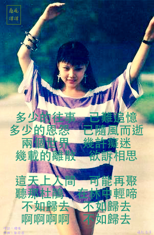 ======================作詞:瓊瑤,作曲:劉家昌======================多少的往事,已難追憶;多少的恩怨,已隨風而逝。兩個世界,幾許癡迷;幾載的離散,欲訴相思。這天上人間,可能再聚,聽那杜鵑在林中輕啼。不如歸去,不如歸去,啊! 不如歸去。
