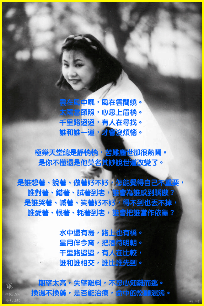 雲在風中飄﹐風在雲間繞。 太陽當頭照﹐心思上眉梢。 千里路遙遙﹐有人在尋找。 誰和誰一道﹐才會沒煩惱。