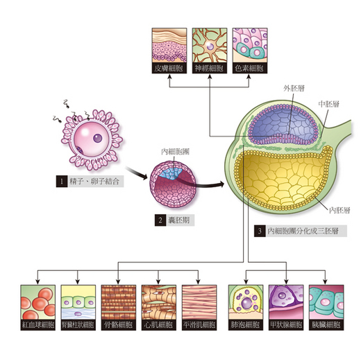 《西遊記》中孫悟空將毛髮變成自己分身的能力,有可能實現嗎?近年來,幹細胞的研究突飛猛進,從身上取出的成體幹細胞,很可能經由誘導而分化出不一樣的細胞。今年3月,《心血管研究》(Cardiovascular Research)刊登了美國紐約州立大學水牛城分校的科學家如何成功利用頭髮毛囊幹細胞培育出皮膚組織。由於幹細胞具分化出新細胞的能力,若未來技術發展成熟,配合基因修補技術,許多難以治癒的疾病很可能因此痊癒,所以有不少人對幹細胞充滿期待。 (影像來源:《科學人》影像資料庫/攝影 徐志初) 分化出新型態的細胞 幹細胞與普通細胞的差異在於幹細胞可以「分化」(見註)出新型態的細胞。人的一生中,皮膚、血液等組織之所以會不斷更新,就是因為幹細胞分化出新細胞,取代受傷或衰亡的細胞。幹細胞的增殖並不對稱,當它由一分為二時,其中一個會保留原來幹細胞的特性,另一個則發展成為有特定功能的細胞。 依照分化能力,幹細胞可分成「胚胎幹細胞」與「成體幹細胞」等。胎兒離開母體後所帶的幹細胞,屬於成體幹細胞,它的特性是在受特定外在因子誘導下,會分化為某一種或相關類型的細胞,例如存在大腦的神經幹細胞會分裂產生神經元以及神經膠細胞,存在骨髓的造血幹細胞則製造紅血球、血小板及白血球等。 依照分化後形成的細胞種類,成體幹細胞又可分為造血幹細胞、生殖幹細胞、間葉幹細胞、心肌幹細胞、肝幹細胞等。隨著年齡增長,成體幹細胞的增殖次數增多,染色體末端的端粒(telomere)會越來越短,造成染色體不穩定,使得增殖能力逐漸變差。 胚胎幹細胞則存在於胚胎的囊胚期(精卵結合後,約5~7天就進入囊胚期)。囊胚期的細胞分成兩大群,外圍屬於滋養細胞群,將來可以形成胎盤的一部份,供應養份並排出廢物;內部的內細胞團即含有所謂的「胚胎幹細胞」,它們可以分化出人體所有的組織細胞。 精卵結合進入胚胎時期第三週,內細胞團會分化成三胚層:外胚層、中胚層與內胚層,此時,已不再具有胚胎幹細胞的萬能性,外胚層僅會發育成表皮細胞、神經細胞等,中胚層形成結締組織、骨骼和肌肉組織,如平滑肌細胞、骨細胞等,內胚層則發育為部份內臟組織如小腸細胞、胰臟細胞等。 精卵結合進入囊胚期時,細胞會分化出外圍的滋養細胞群和內部的內細胞團,內部的內細胞團即含有所謂的「胚胎幹細胞」,它可以分化出三胚層:外胚層、中胚層與內胚層,三胚層再繼續分化出人體所有的組織細胞。 (電腦繪圖/姚裕評) 透過基因調控,誘導幹細胞分化 由於幹細胞能分化出新細胞,可用於修復受損的組織或器官,因此培育、移植幹細胞成了現代醫學用以治療難癒疾病最具潛力的方法。其中,胚胎幹細胞因為具有分化成各種組織幹細胞的能力,是最佳的培育對象;然而胚胎幹細胞只存在於胚胎,來源與取得都涉及道德倫理問題,目前的人體研究仍以成體幹細胞為主。 幹細胞的分化行為主要是由細胞核裡的基因控制,因此若能經由適當的基因調控改變基因指令,就可能誘導幹細胞改變分化行為,導引其往設定的方向分化,例如讓骨髓幹細胞分化出肌肉細胞、結締組織等。誘導的方法包括改變幹細胞培養液的成份、插入特殊基因到幹細胞內等;不過整個手續相當複雜,因為培育過程必須考慮幹細胞的存活、增生和分化的微環境,以及何時需要什麼種類、什麼濃度的生長因子等,因此就目前的技術而言,誘導幹細胞分化,並100%往特定方向分化的成功率並不高。 即使找出導引的方法,仍有其局限,例如從中胚層發育的幹細胞,比較有可能誘導出同樣在中胚層發育的細胞,若要誘使中胚層的纖維母細胞形成外胚層的神經細胞,比較可行的方法是先讓它回到胚胎幹細胞狀態,再從胚胎幹細胞形成神經細胞,然而如何讓纖維母細胞變成胚胎幹細胞,目前雖已建立相關技術,但尚不成熟。 雖然幹細胞研究面臨許多挑戰,且其中的研究還需多久才能應用至人體,尚不能斷定,但由於它能為許多神經受損、罹患先天性疾病、需器官移植的病患帶來一線曙光,因此各國無不加緊研究,希望整合學界與產業界的技術、人力及物力資源,早日讓幹細胞、組織工程及再生醫學等有突破性的發展。 註:細胞分化是指某一個體細胞進行細胞增殖時,會出現型態、功能等與原細胞不一樣的細胞,這個過程稱為分化。它與細胞分裂不同,細胞分裂是細胞進行增殖時,只會產生型態、功能與原細胞相同的細胞。 誘導體細胞成為胚胎幹細胞的神奇技術 長久以來,科學家對於啟動胚胎幹細胞往不同組織分化的機制毫無頭緒,直到比對胚胎幹細胞與普通細胞的差異後發現,在胚胎幹細胞裡,有些基因的表現非常活躍,因此科學家猜測可能就是這些基因促使它具有分化成不同組織的潛能。 2006年,日本京都大學幹細胞生物學家山中伸彌(Shinya Yamanaka)的研究小組發現,只要從這些表現活躍的基因中,取四個基因送入已經完全分化的細胞,就可以使細胞重新設定,回到有如胚胎幹細胞、具多能性分化功能的細胞,稱為「誘導多能性幹細胞」(Induced Pluripotent Stem cell, iPS細胞)。這種方式在老鼠的細胞實驗中已經獲得初步成功。 2007年11月,這項實驗又有新的突破,山中伸彌與美國威斯康辛大學幹細胞及再生醫學中心的解剖學教授湯姆生(James Thomson)分別率領兩個不同的研究團隊,幾乎在同時做了相似的實驗:他們利用病毒把四個