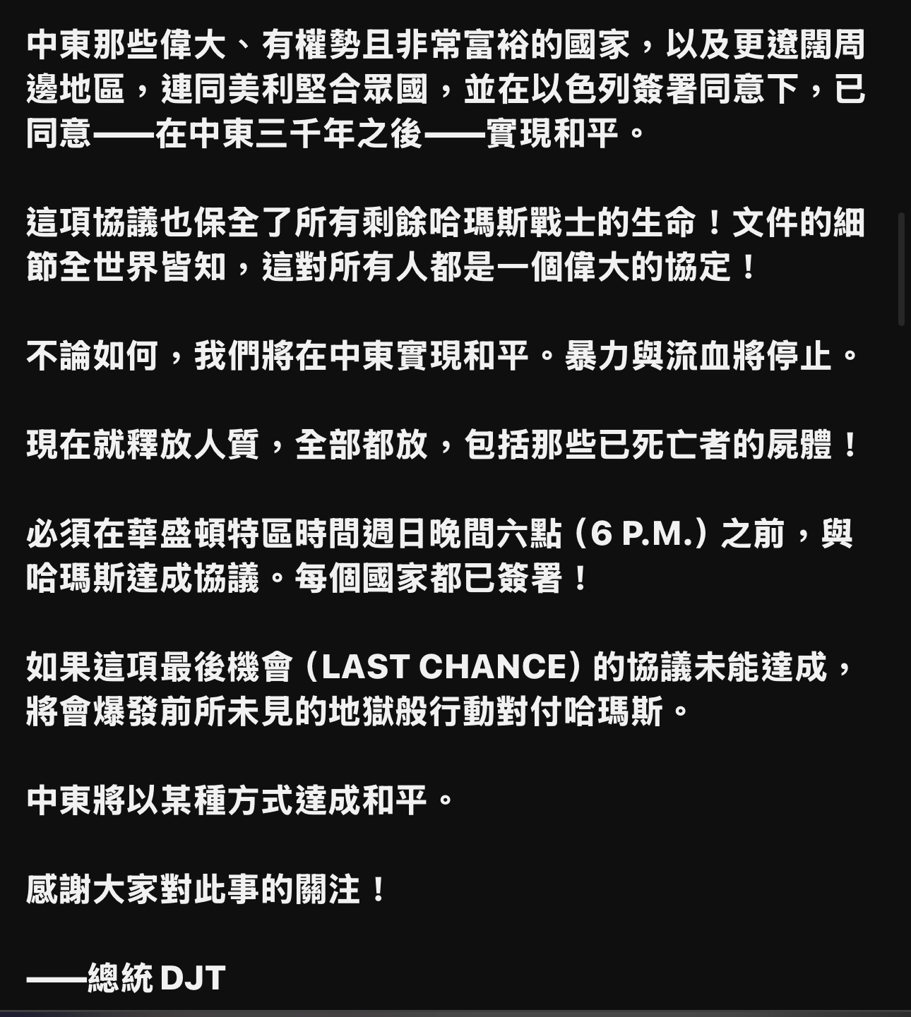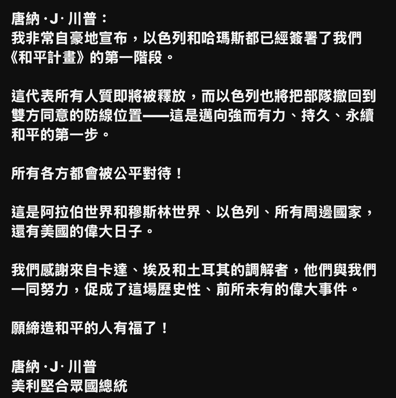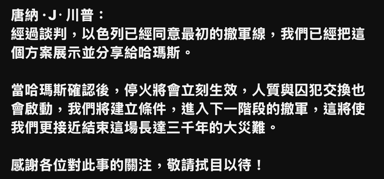 川普同時在白宮發表視頻演說: 「我要感謝那些幫助我促成這件事的國家,卡達、土耳其、沙烏地阿拉伯、埃及、約旦,以及其他許多國家,有那麼多人如此努力促成,這是個重要的日子,我們拭目以待結果如何,我們必須將最終協議落實成白紙黑字,非常重要的事,是我期待人質最終能回家與父母團聚,不幸的是你知道有些人質,他們的狀況,同樣想回家與父母團聚,他們的父母對他們那些年輕男女如同還活著的一樣,所以我只是想讓你們知道,這是個非常特別的日子,在許多方面也許是前所未有的,確實是前所未有的,感謝大家以及那些幫助我們的國家,我們得到了巨大的援助,所有人都團結一致,希望這場戰爭結束後看到中東實現和平,我們非常接近達成這個目標,謝謝大家,每個人都將得到公平對待。」