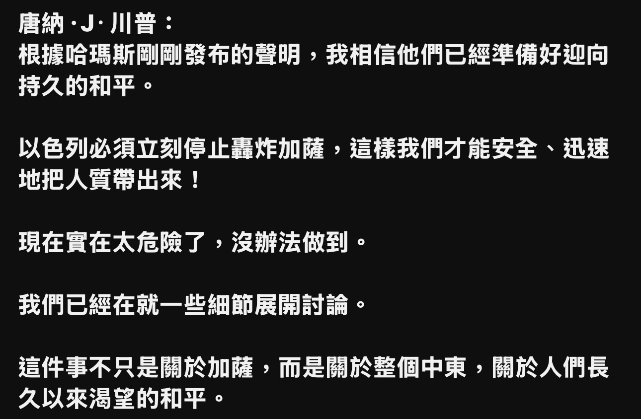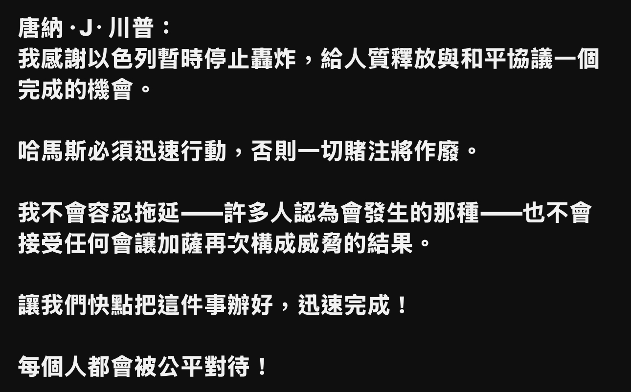 這是川普的一次「豪賭」,贏了的話,就是成就中東和平的偉人,輸了就是點燃火藥桶,在時間緊迫的壓力下,哈瑪斯若想活命,應該知道其火力不是以色列、美國的對手,果然,第二天哈瑪斯給出回應了: 「原則上同意該計劃釋放所有人質,但希望對該計劃進行若干微調」 川普立即給予回應