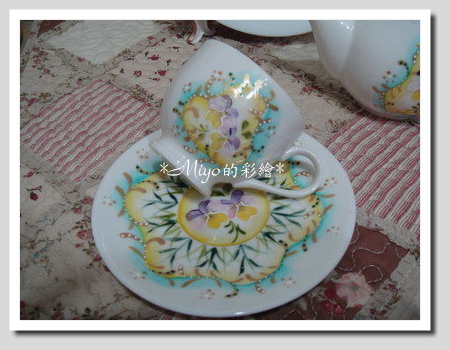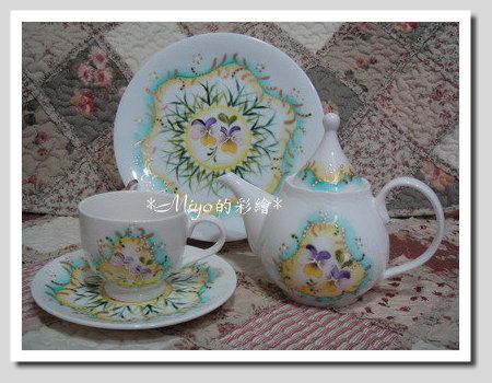 這陣子都悶在家裡好久沒和朋友去喝下午茶了坐在桌前想念著悠閒的午茶風情有些感嘆~~拍照的技巧不好沒辦法拍出這組瓷器的特色來看著這組作品突然想起我還有個陶瓷的case沒畫好久沒聯絡或許對方會以為是miyo不想畫了吧~~唉~~年紀大了記憶力似乎也越來越差了......