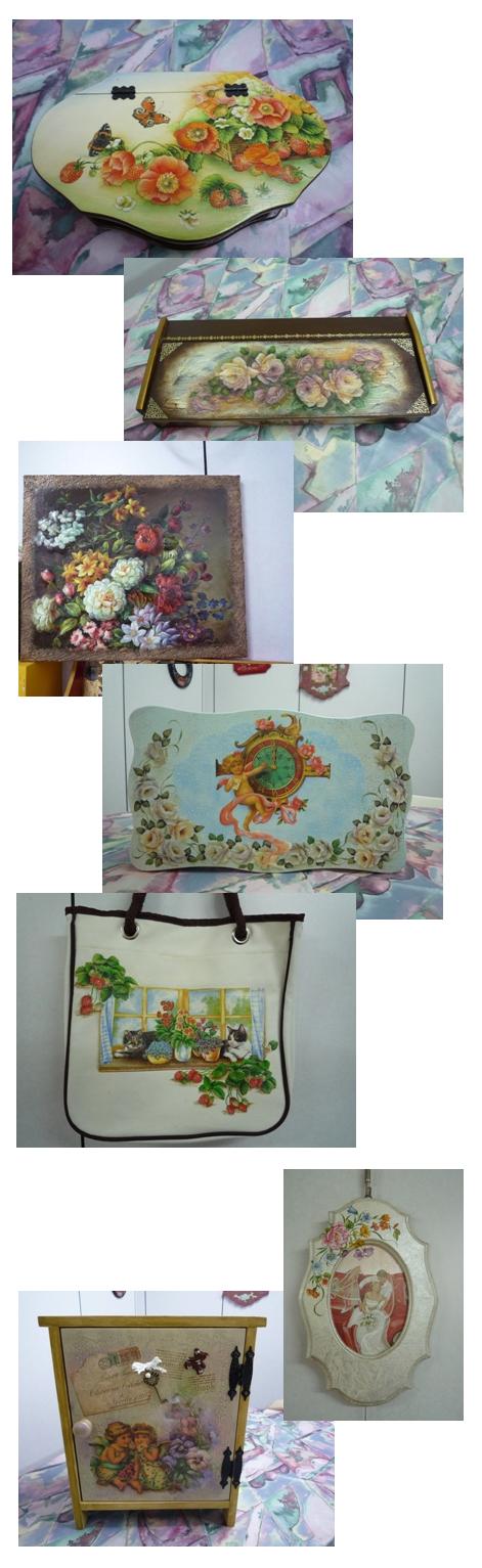 費用 (33000)含十一件木器素材、兩件瓷器素材、一張畫布、一個購物包三十張餐巾紙、三張綿紙、三張專用紙、金質貼紙五張、一吋平塗筆一支、3/4橢圓筆一支、3號丸筆一支*結業後可領取中華民國傢飾彩繪協會A級拼貼講師證書,證書費2500元歡迎洽詢^^