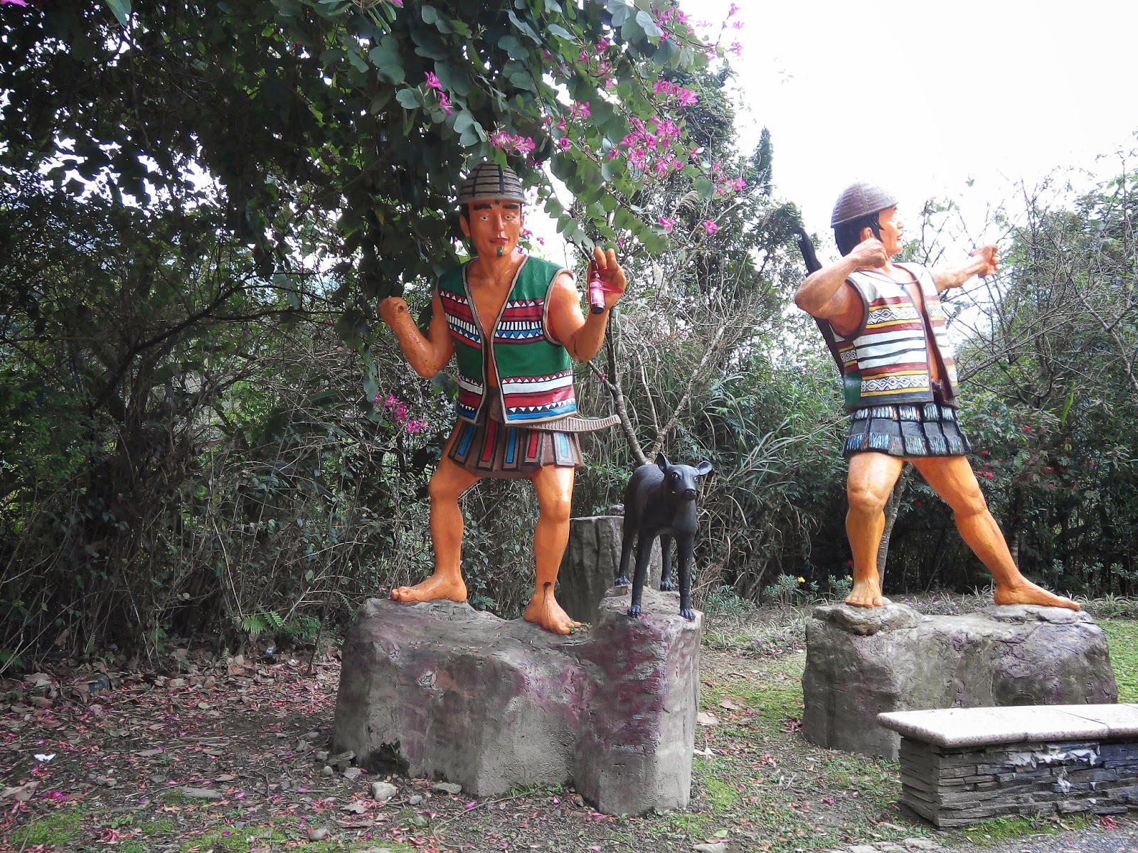 過了碧潭吊橋,繞過捷運站,往新烏路騎。一路上山,並不陡,比起東眼算是輕鬆的。而且新烏路並不是一路的上坡,間歇性的上、下坡,讓騎乘更愉快。也因此,我有更多的時間觀賞沿途的風景。新烏路是順著新店溪走的,整條路幾乎都可以欣賞到新店溪美景。路邊還有原住民雕像,其中有兩個特別吸引我的注意力。一個是原住民打獵雕像,雕得不算很好,但是很有原住民驃悍的感覺,只可惜弓箭、武器有些缺損。還被幽默的人改成了米酒瓶,看了不禁讓人莞爾。另一個是原住民飲酒雕像,應該是結婚時喝交杯酒的圖像。我停車在對面車道,注視暇思,心中浪漫情懷油然而生。