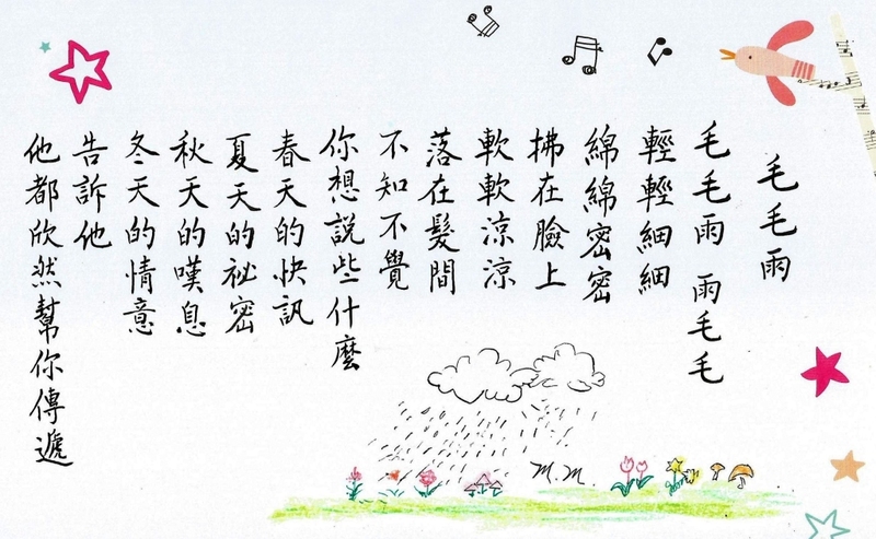 毛毛雨 雨毛毛 輕輕細細 綿綿密密 拂在臉上 軟軟涼涼 落在髮間 不知不覺 你想説些什麼 春天的快訊 夏天的秘密 秋天的嘆息 冬天的情意 告訴他 他都欣然幫你傳遞 |