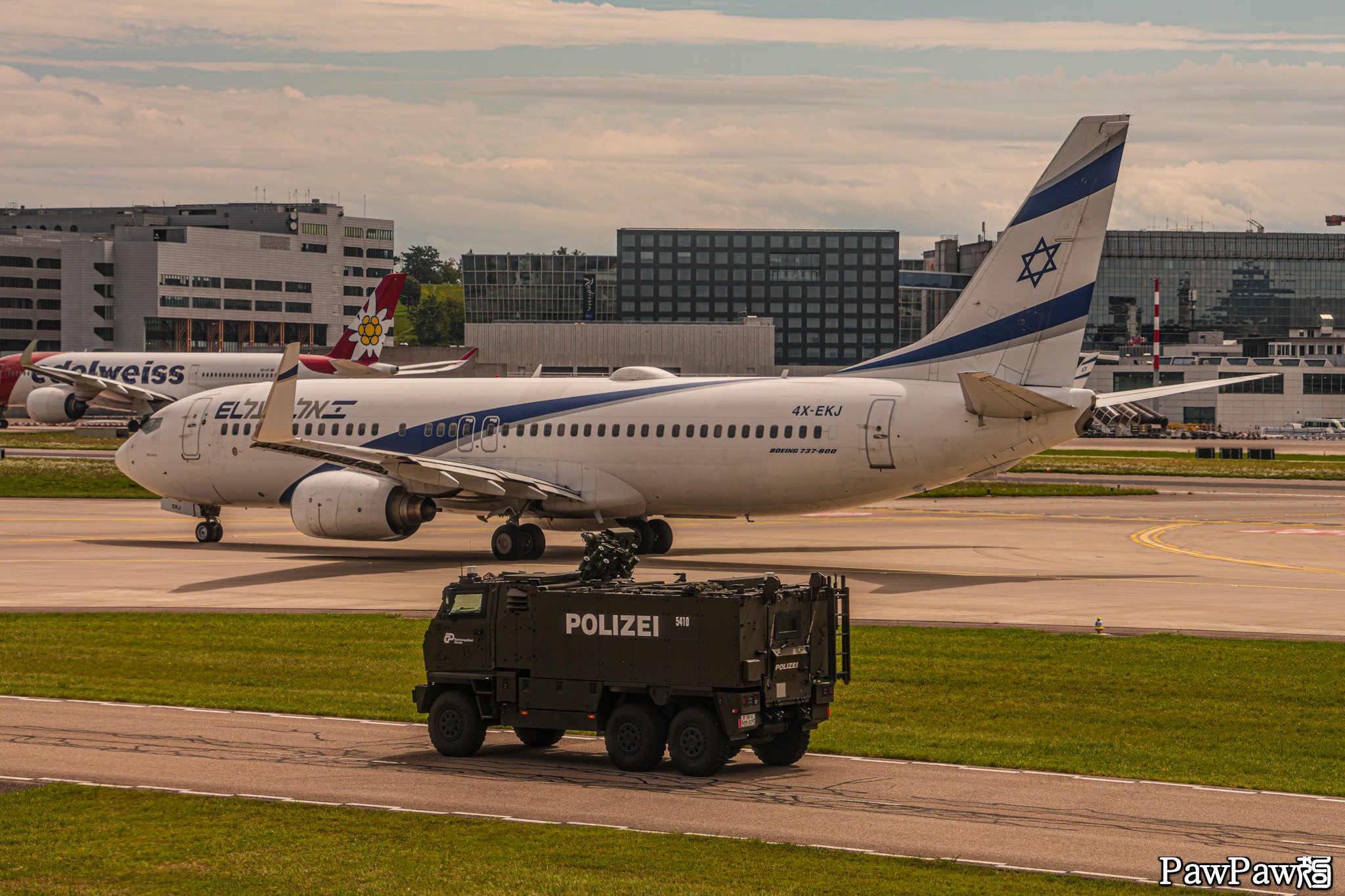 不知是否巧合,貓狗去年在蘇黎世搭機時,看到有輛瑞士警察用的武裝運兵車看似是與一架以色列航空的飛機伴跑。確實,不要說以色列自建國以來就摩擦與戰爭不斷,而近年更是因無差別的對巴勒斯坦人進行種族滅絕式的屠殺,導致歐洲許多國家對與以色列有關的場所事物都得特別小心被攻擊,所以看到有武裝運兵車與以色列的民航機伴跑也說不上是希奇事。