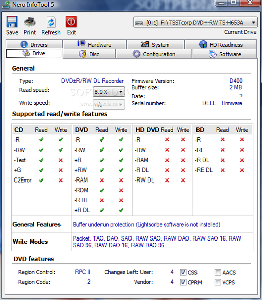 軟體名稱:Nero InfoTool 軟體版本:5.3.3.0 授權類型:免費軟體 支援語系:繁體中文 官方網站:http://www.cdspeed2000.com/ 檔案下載:官方網站下載頁面 檔案下載:官方FTP站下載(1.65MB) 更新日期:2008/10/1 軟體簡介: Nero InfoTool 是光碟檢測、光碟燒錄的常用工具,它可以檢測光碟支援的讀取和寫入格式,檢查光碟的類型及製造商等訊息。