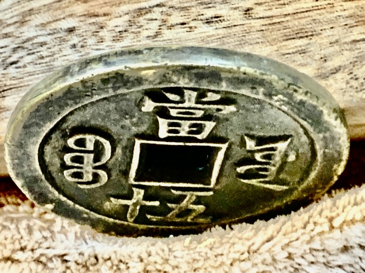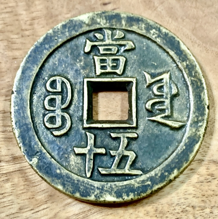 這枚「咸豐重寶當五十」大銅錢,是我38年前購於台北光華商場的大中華郵幣社,當時的價格大概不到$1000台幣。之後就一直擱著,只是知道它概略的歷史。五年前,再看到這枚大銅錢的時候,想著古物活用,就拿來當作泡茶時的壺墊,還蠻好用的,也沒有多想。直到最近,在研究我收藏的一系列錢幣的時候,順便做了比較深入的研究,才知道這枚「咸豐重寶當五十」大銅錢確實有其價值。
