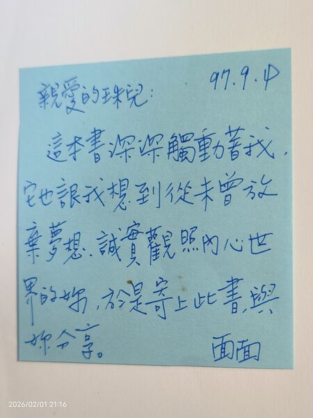 我的雀躍心情來自於多方面,首先是遇見了知音般的欣喜。面面隨書附上一張小紙:「親愛的珠兒,這本書深深觸動著我,它也讓我想到從未放棄夢想、誠實觀照內心世界的你,於是寄上此書與你分享。」一種被了解,讓朋友掛在心懷的感動!茫茫人海中,我們因網路而結緣,平日雖忙碌彼此不常留言,但對於所發表內容都記在心裡。