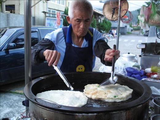 選坐在頭城車站前,一口咬下阿公做的蔥油,那口感有些像不一樣三明治麵糰的鬆和Q。阿公的純手工做的蔥油餅才是許多小吃標榜自己是古早味的真品,有機會到頭城,不妨到車站前找阿公,買個阿公手腳俐落炸起的蔥油餅嚐嚐,相信以前那個生活悠緩,物質不是很充分,但精神卻充實的年代歲月,應該是會漸漸因蔥的香氣縈繞胸臆,給自己一份往事只能回味的甜蜜感!