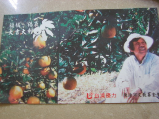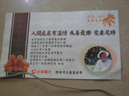 約莫兩三個禮拜前吧?我到台灣優力加油,結帳後工讀生雙手捧來一袋像市場賣洋葱、蒜頭的網袋,說是要送給我的。定睛一看,是袋柑桔。一落七八顆擠在袋中,裡頭同時附了張卡片。老實說,心中除對加油站贈品的不斷翻新,略有所感外,並未投以太多注目。上車後隨手一擱便打道回府。