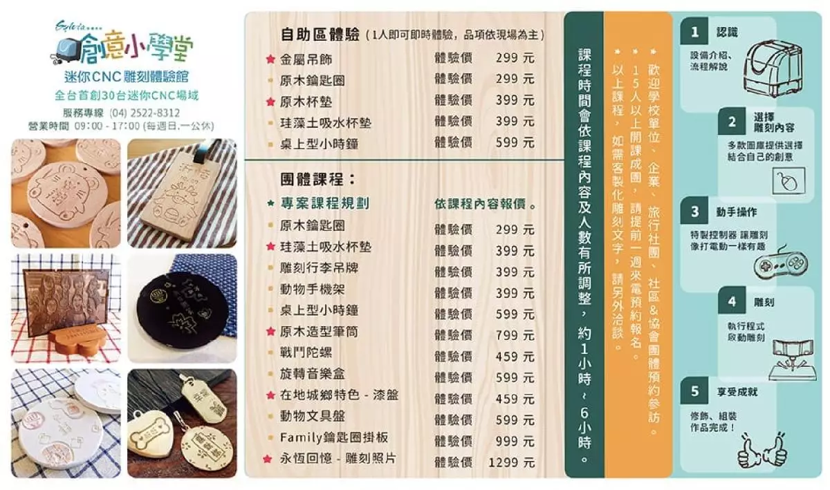 Sylvia創意小學堂–迷你CNC雕刻體驗館,位於台中市豐原區,為全台首創提供30台miniCNC互動體驗的場地,一走進創意小學堂,陽光灑落,窗明几淨,在店長親切甜美的招呼之下,一顆心也溫暖了起來。透過小學堂的雕刻機,不僅能雕刻出一份禮物,紀錄美好;同時,大人和小孩也能透過雕刻機,雕出專屬於你的創意和夢想!一個紀念,讓人更懂得生活,一份心意,用自己的方式讓距離更近些,一個美好的體驗,讓你的生活更加充實有趣。
