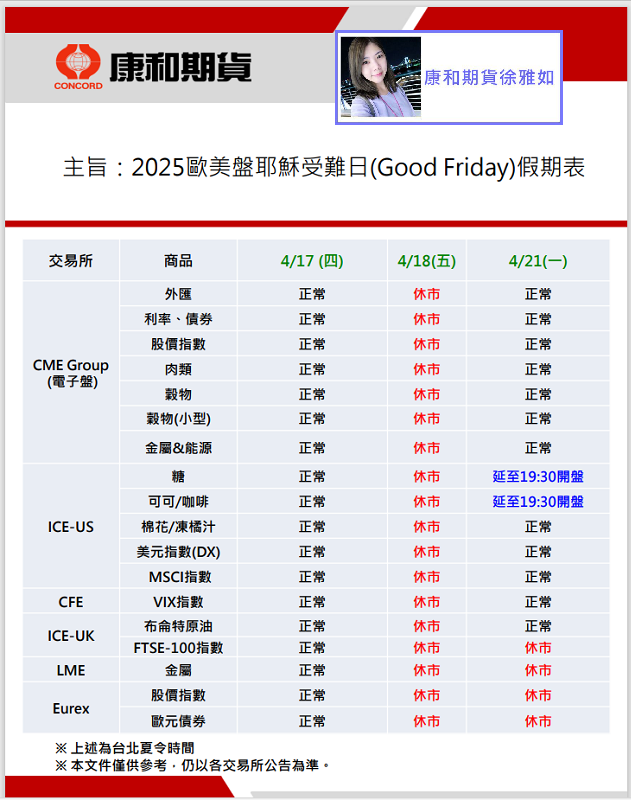 4/21(一):部分商品延後開盤/休市