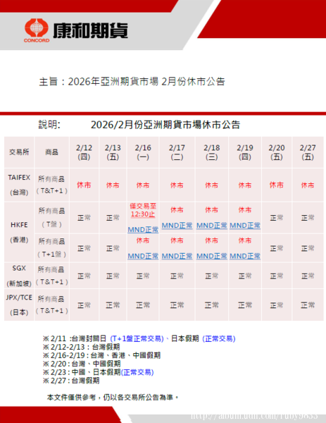 亞洲期貨市場2026年1月份休市公告@台中康和期貨徐雅如期貨選擇權海期手續費#外期海期期貨手續費