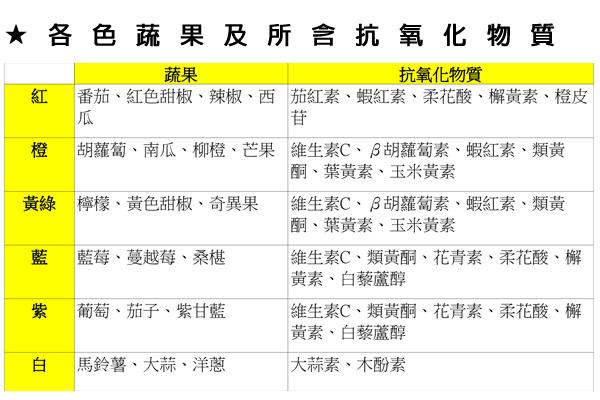 研究分別檢測蔬果本身、受試者每階段前後血液內抗氧化物質含量及抗氧化能力,結果發現,綠白色蔬果維生素C含量高,橘黃色蔬果主要含類葫蘆波素,紅紫色蔬果則富含多酚及花青素(花青素是多酚的其中一種類)。