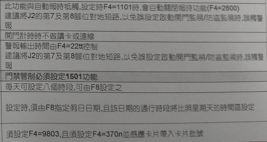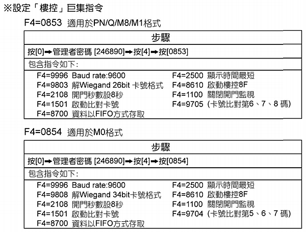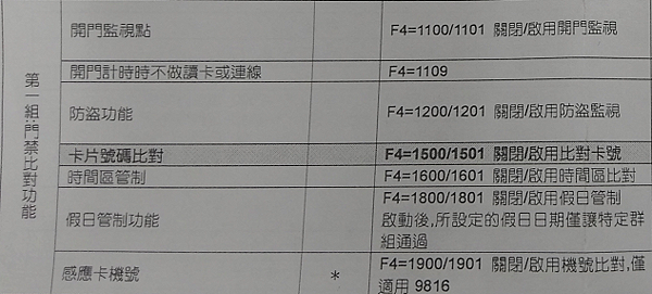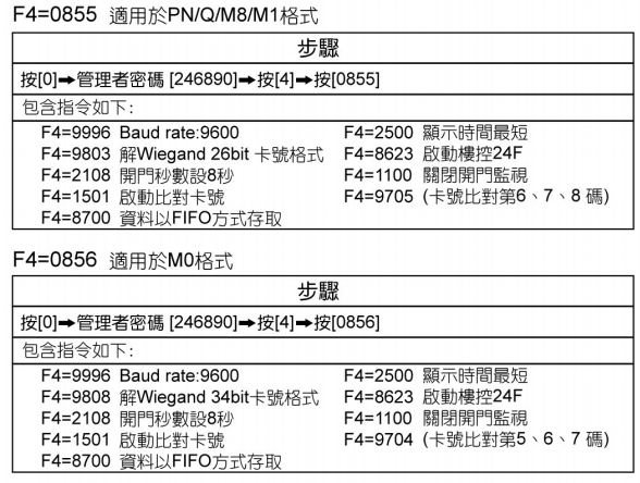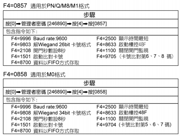 系統初始值設定參數及還原 ※於刷卡機按 0 後,按 246890(預設值)再按 4, 即可進入 F4 模式 (預設密碼可由 F4=4609 修改) 當機器要使用時, 請先設定F4=0016 / F4=0018 / F4=0019 / F4=0072, 以防止時間區資料佔用到記憶體,導致卡號無法正常輸入。 所謂系統初值即該機器出廠時所設定之參數值由 F4=0850(離線模式)或F4=0750(連線模式)所設定, 使用者可依實際需要而作局部修正。當使用者每次以出廠值修改成個人化模式後可以F4=0650加以儲存, 而當系統參數遭破壞或遺忘 時可以0950設回個人化參數值。 (粗體字為常用功能 / “*”為選項功能)