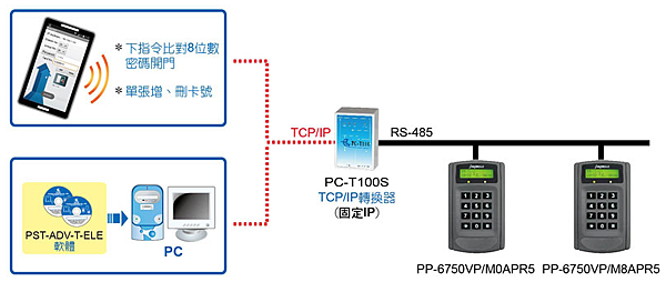 使用安卓手機 APP 遠端開門/增刪卡號: 系統架構: PP6750 VP + PC-T100 + ELE-SW + Android 手機 APP
