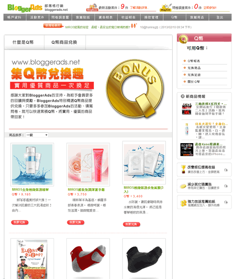 點圖進去,三步驟立刻加入會員喔! 我申請BloggerAds的時間還真的是久到自己都給他忘了,當然以前也就只是掛在部落格的側欄廣告賺點飲料錢。 一直到去年我才有開始在參加他的許多好康活動,不只是試吃試用這麼簡單,還有一些像是好讚分享跟貼貼樂、主題徵文的活動,都有Q幣大方送,這些Q幣還可以去兌換很多好棒的商品呢!