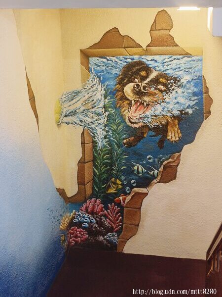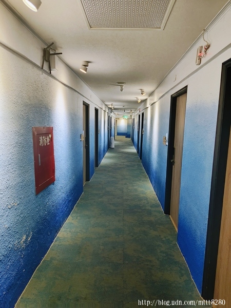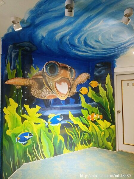 從鏡子裡看在藍色夜空裡悠遊的鯨魚,好夢幻啊!(完全被這幅圖勾住~) 好啦!回到主題,房間還是要介紹一下,明亮的白色房間,桌上還有瓶裝水,桌子的角落可以掛衣服。茶包跟備品放在一起。 廁所不大,看中它乾淨整齊,睡前在浴缸泡了個澡,已經心滿意足。 走廊也是我很喜歡的水藍色。不管是像鯨魚悠遊的水藍色天空,或是海底,都讓人感到靜謐。 在我們所住的樓層,從電梯出來,可以看到可愛的海底景象。張著嘴巴的海龜,還有游來游去的黃色小魚。話說這隻海龜不只嘴巴張得好大,眼睛也張得好大。 這是名副其實的「海狗」? 來宜蘭就是來放鬆……雖然有一部份是工作,但找一個讓人覺得舒服的飯店也很重要。把帝王行旅的官網網址順便放上來,有興趣的人可以看看。來礁溪泡溫泉、吃美食,享受個慵懶的時光吧! 帝王行旅:https://www.king-hotel.com.tw/