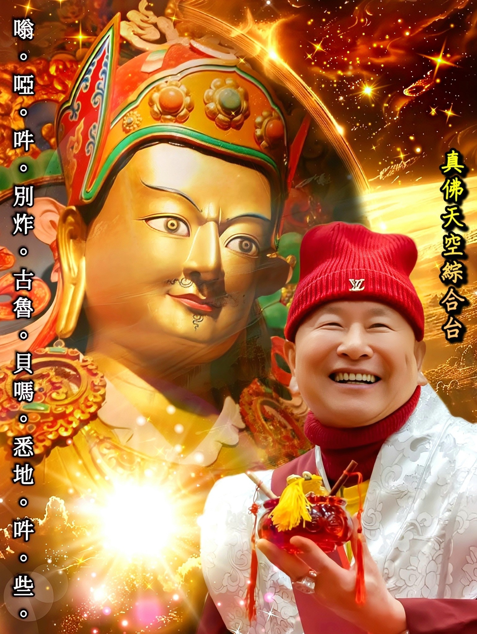 師尊開示:「蓮華生大士」即「蓮師」,又稱「海生金剛」,是西印度達拉郭嘯海,五色蓮花化生的「蓮花童子」;是「阿彌陀佛、觀世音菩薩、釋迦牟尼佛」,身口意三密的金剛應化身。