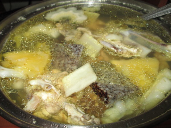 苦瓜對身體不錯,又有清暑滌熱、明目解毒....等功能,所以夏天特別適合煮食。 【鳳梨苦瓜雞湯】 主要食材: 苦瓜一小條(颱風天買35元、颱風後買25元、沒有颱風時...20元應該有?約300公克) 雞胸骨(全聯20~25元) 鳳梨醬(一罐一百元可以用很久,單次使用四小片鳳梨及一小湯匙醬汁) 副食材: 嫩薑或老薑少許。(我喜歡嫩薑切片下去煮,但應該是老薑比較香?) 米酒。(給雞去腥用的) 豬血糕小小塊。(純粹怕喝湯吃不飽,所以.....) 目前試煮的流程: 1.煮一鍋開水,水滾後倒一些出來川燙雞胸骨(加米酒一起燙雞肉,我不喜歡煮熟再加米酒)。 2.把切好的苦瓜跟川燙後的雞胸骨放進去煮,用小火慢慢煮,絕對不能用中火或大火,雞肉會變柴柴硬硬的! 3.15分鐘後把薑片跟鳳梨片及一小匙醬汁放進去調味(鳳梨片及醬汁很容易讓雞湯過鹹,所以不要放太多,沒把握就醬汁留最後再放下去調味),然後繼續煮15分鐘,煮好後關火(留在電晶爐上用餘熱續煮),半小時後再打開來喝就不會太燙,風味也剛好。 食用感想: 雞胸骨煮湯雖然不美觀,想啃點雞肉也有些累,但便宜嘛,一鍋湯食材成本50~60元左右,當1~2餐吃,很划算。如果買一盒雞翅或棒棒腿,成本就要增加25~30元,必須慎重考慮。 至於風味上來說,鳳梨苦瓜雞湯應該最主要就是喝那鳳梨醬搭上苦瓜及雞肉的味道,有人是再加上小魚干來做基底風味調和,這次我想煮單純一點,不加其它調味,單純就是以鳳梨片及醬汁來調出自己想要的鹹度。原則上是湯喝下去覺得,嗯,順口,就好了,不夠鹹也沒關係,喝久自然會鹹了^^。 另外加了大約六小片的豬血糕(成本約6元),這樣吃下去增加飽足感,我是一鍋流,煮了一樣東西就這樣東西吃到飽,很懶得另外煮些什麼,所以這湯很方便,豬血糕也很方便。 食材處理: 雞胸骨:上下對折,用暴力拆開胸骨跟胸背,也就是一份拆成兩份,共2*2,比較方便食用(無須拿刀砍,雞骨很軟,手拆折斷就行了,但要注意別被雞骨刺傷,千萬小心,或亮刀吧)。 鳳梨片:因為我燉湯的時間不夠長,所以鳳梨片下鍋前要用叉子把鳳梨片分割一下,就隨便弄,把肉弄散一點,不然鹹味會留在鳳梨裡,煮好後誰也不想吃鹹死人的鳳梨肉吧?(可能也沒多少人想吃它,我是不想浪費)。 苦瓜:這比較傷腦筋。 中間那個白色的部份及苦瓜子都要用鐵湯匙挖掉,理論上是挖不乾淨,怕苦的人可能要用刀工再來處理。懶人就苦瓜不要切太大片,讓白色內膜不要太影響口感(多少會影響)。 原則上內膜清乾淨了,苦瓜就苦不起來,但這樣就不像苦瓜了,吃起來覺得它很沒個性,不喜歡。 所以....看個人喜好及接受程度了。 就醬,心得記錄完畢^^ |