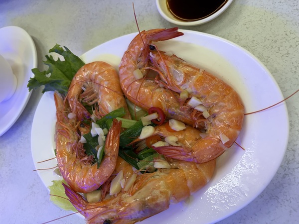 * 白灼大蝦: 這盤蝦子又大又肥!只用簡單的蔥、蒜、辣椒提味,剝開紅通通的蝦殼,蝦肉扎實彈牙,沾點旁邊的醬油膏就完美了。